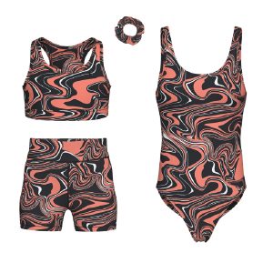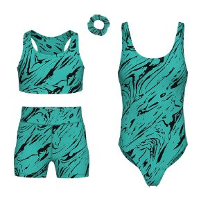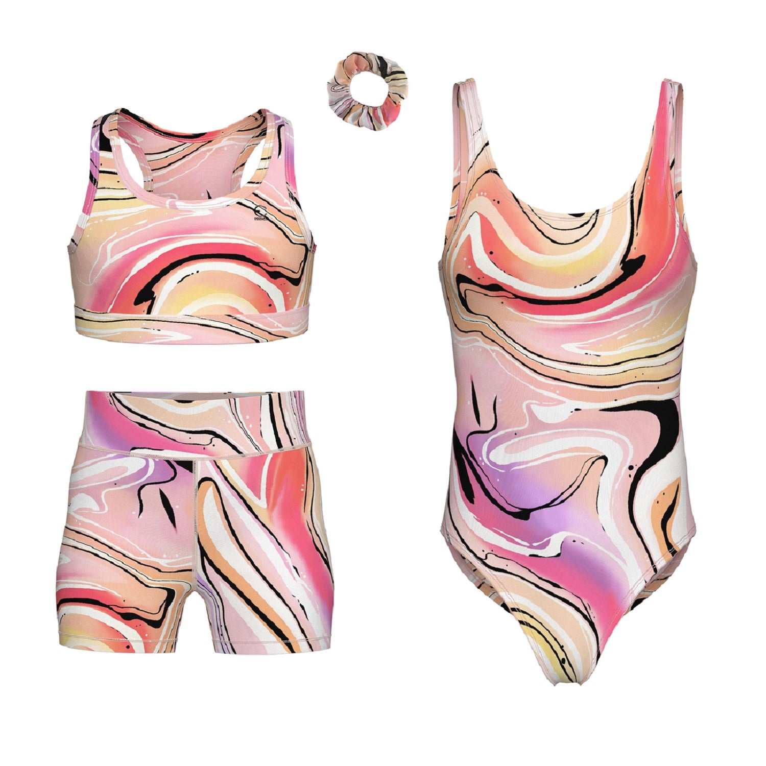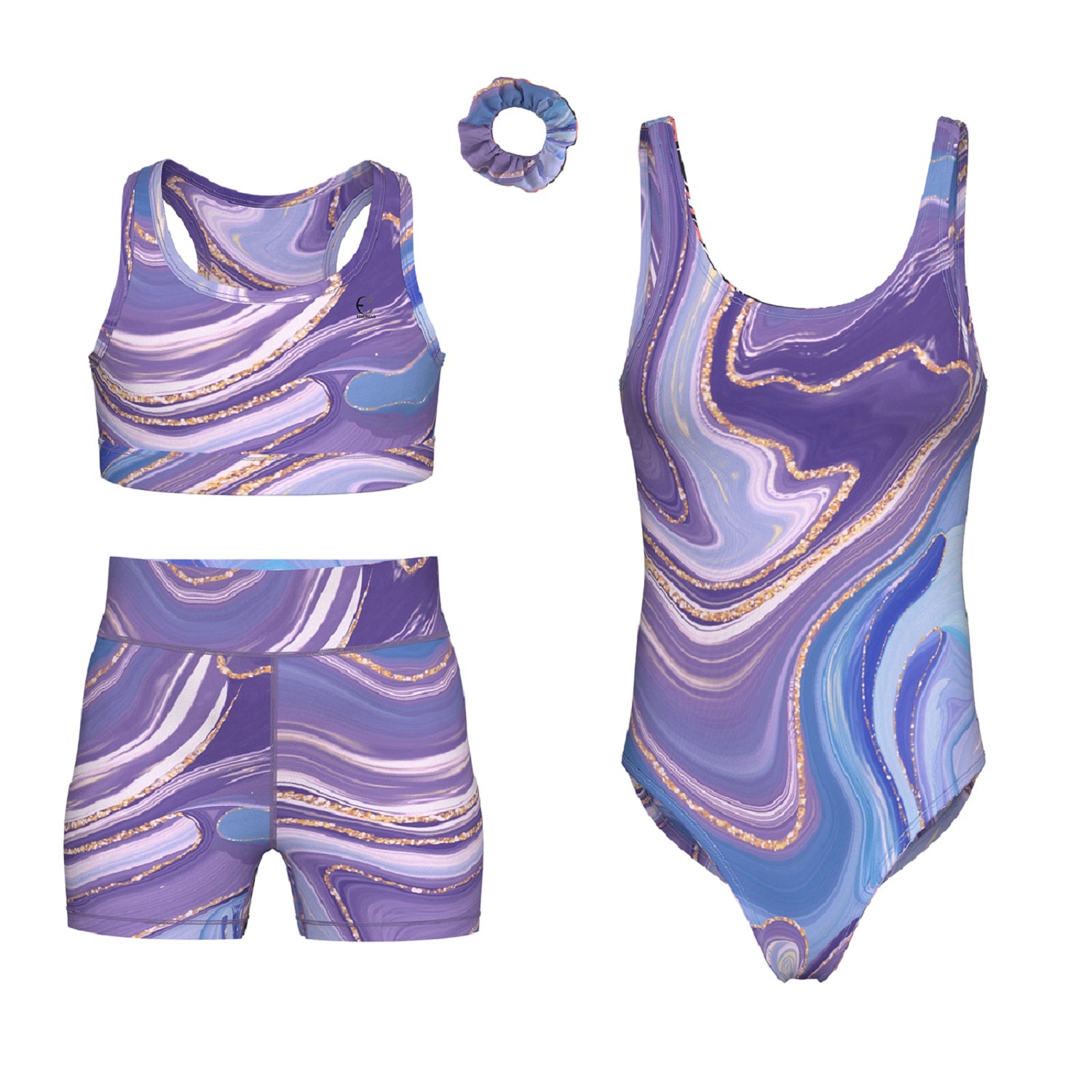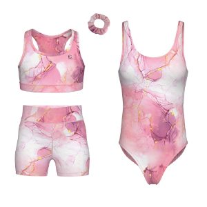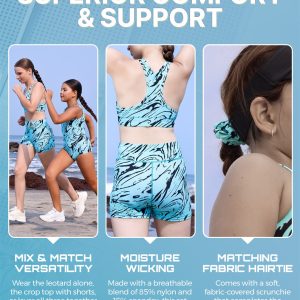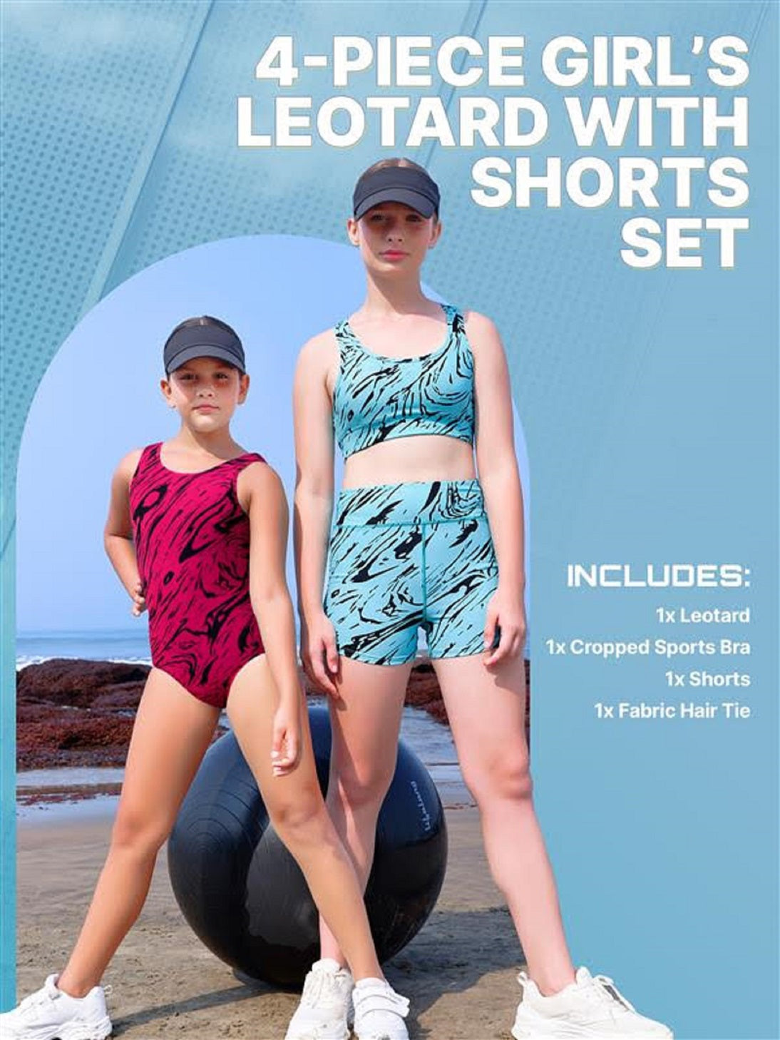 Essenclo Gymnastics Leotards for Girls with Shorts Set is the perfect blend of style. comfort. and performance for young athletes. This four-piece gymnastics outfit for girls includes a leotard. a cropped sports bra. matching shorts. and a fabric-covered hair elastic tie. providing a complete and stylish look for gymnastics. dance. and activewear. Made with breathable and lightweight fabric. this set offers a soft and stretchy fit that keeps her comfortable through every move. The moisture-wicking material ensures she stays dry and fresh. even during intense routines. Designed for versatile three-way wear. she can wear the leotard alone. mix and match with the shorts set. or layer them together for extra coverage. With cute and colorful designs. this set allows her to express her personality while standing out at practice. competitions. or casual workouts.