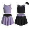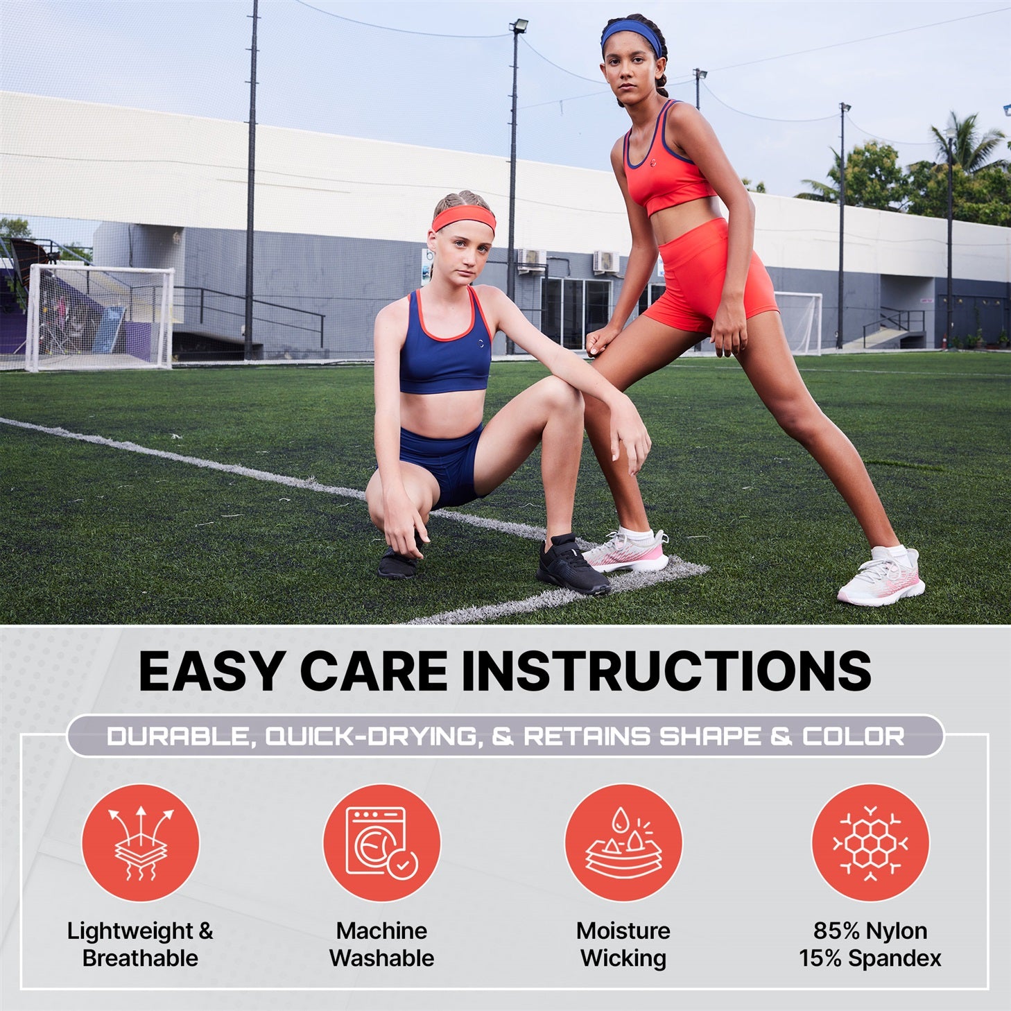 Essenclo Girls Athletic Tank Tops & Biker Shorts Sets. the versatile and comfortable option for active young girls. Each 5-piece set includes 2 pairs of biker shorts. 2 sleeveless tank tops. and a reversible headband. available in sizes 3-16. Crafted from a lightweight blend of 85% nylon and 15% spandex. these outfits offer a 4-way stretch. ensuring breathability and ease of movement during various activities such as gymnastics. volleyball. yoga. dance. cheer. or casual wear. Featuring moisture-wicking technology. these sets keep kids cool and dry. making them perfect for sports and outdoor play or everyday casual wear. The athletic tops are designed with a crew neck. sleeveless cropped tank top with a racerback for enhanced freedom of movement and coverage. Paired with compression spandex biker shorts featuring a comfortable hidden elastic waistband. these sets offer both style and functionality.