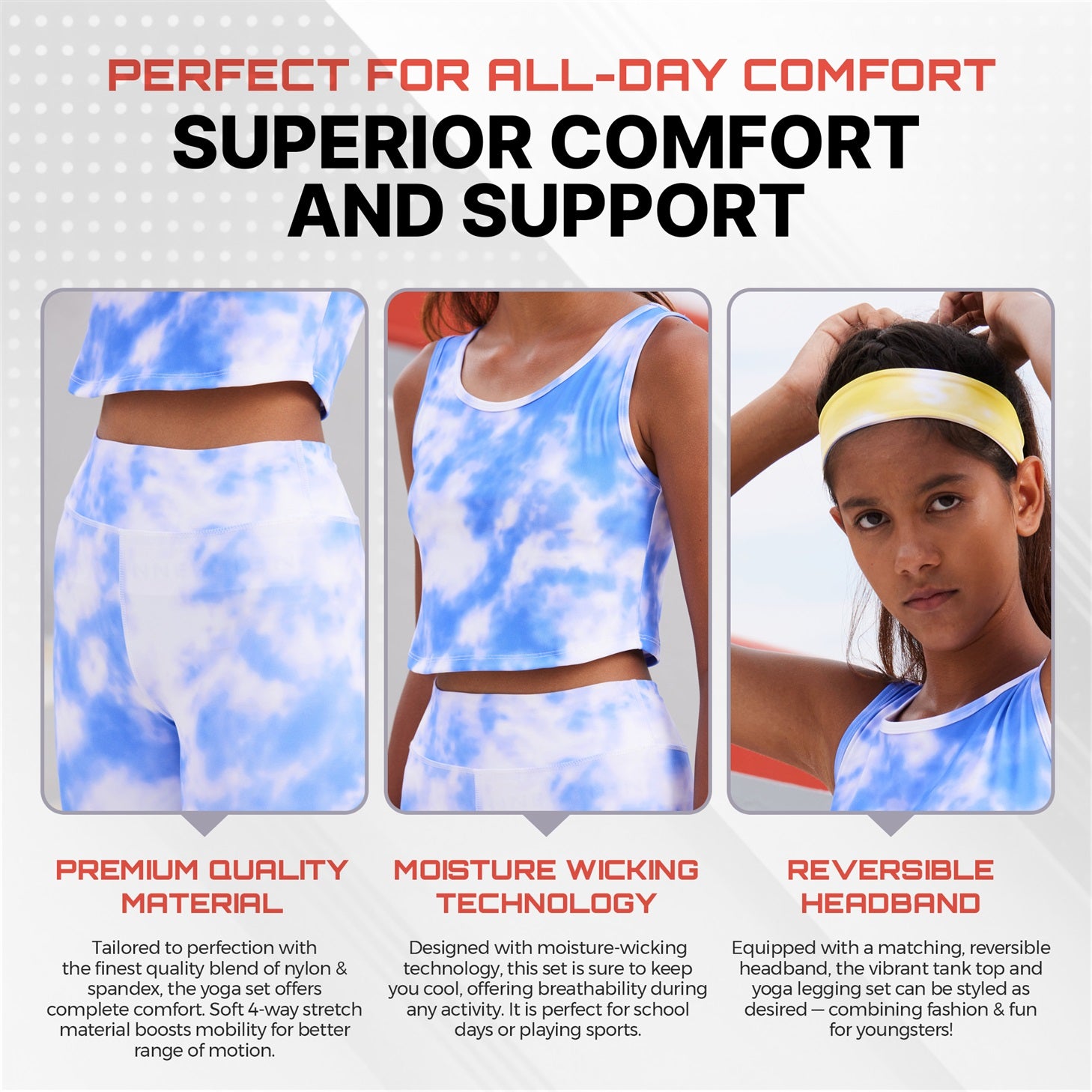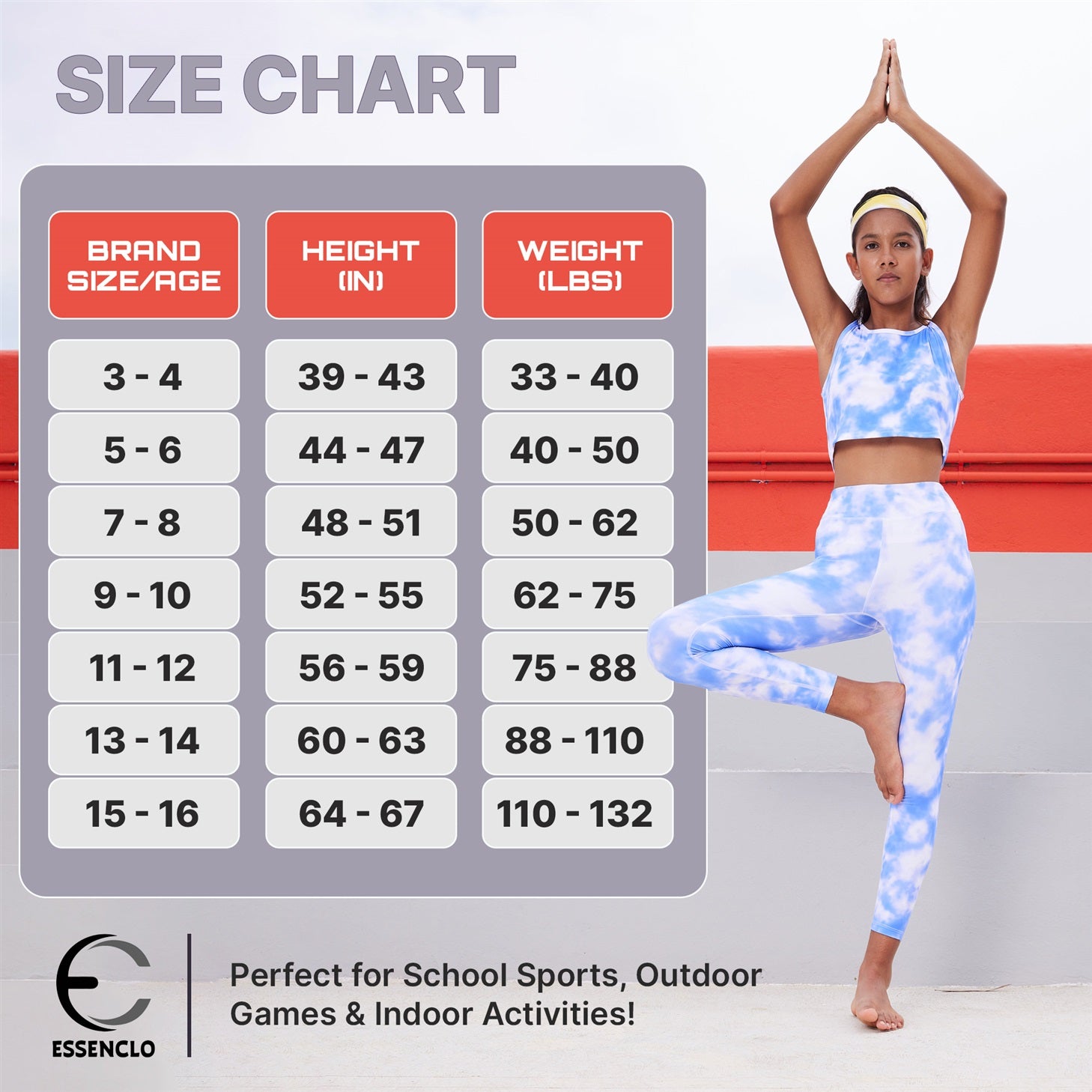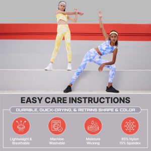 Essenclo Girls Tank Tops and Athletic Leggings Yoga Pants printed sets include (2) girls athletic tops. (2) pairs of girls athletic leggings and (1) reversible headbands for kids in sizes 3-16. The girls tank tops provide freedom of movement. while the yoga pants offer comfort and support for active girls. whether it’s yoga class. dance practice. or simply lounging at home. Crafted from a premium-quality fabric blend of 85% nylon and 15% spandex with a 4- way stretch for a full range of motion. Great for running. dancing. bending. stretching. or jumping. kids can move with ease and comfort.